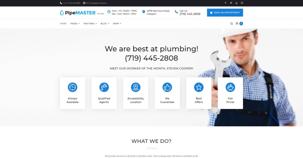 Dit is een eenvoudig, snel en gebruiksvriendelijk WordPress-thema voor loodgietersdiensten voor uw website voor loodgietersdiensten. Hiermee kunt u uw loodgietersbedrijf starten met een volledig functionele website. Uw klanten kunnen met slechts een paar klikken op de knop contact met u opnemen. Met de meegeleverde plug-in voor geboekte afspraken kunnen uw klanten direct een afspraak maken en gratis langskomen voor spreekuren. Je zult ook heel gemakkelijk klanten kunnen aantrekken met behulp van onze plug-in Testimonials. Met dit WordPress-thema is het ook gemakkelijk om uw klanten te registreren en feedback van hen te krijgen. Het ondersteunt ook blogfunctionaliteit, zodat u eenvoudig een blog kunt opzetten over uw bedrijfsnieuws en wijzigingen. Inclusief 24/7 levenslange ondersteuning. Dit is een Parallax Small Business WP-thema