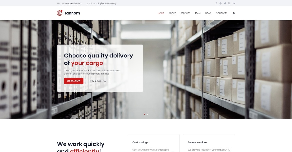 Bent u op zoek naar een manier om uw logistieke diensten te presenteren? Wilt u uw klantenbestand uitbreiden? Trannom is een geweldige oplossing voor dergelijke behoeften. U kunt eenvoudig een overzichtelijke website maken en bezoekers voorzien van relevante informatie over uw verhuisbedrijf. Het Trannom-thema heeft een minimaal ontwerp en krachtige functionaliteit. Er zijn vooraf gemaakte pagina's, zoals Home, Over, Services, Team, Nieuws en Contacten, waar u de benodigde informatie kunt toevoegen. U past de website aan uw smaak en doeleinden aan met behulp van de Jet-plug-insbundel voor Elementor-paginabuilder. Met de JetThemeCore-plug-in selecteert u vooraf ontworpen secties over verschillende onderwerpen en voegt u deze met een paar klikken in pagina's in. De JetElements-plug-in biedt veel speciale widgets voor het maken van verschillende inhoud zonder enige codeerkennis. De JetBlocks-plug-in zal nuttig zijn door extra functionaliteit in kop- en voetteksten te implementeren. U voegt animatie-effecten toe aan pagina's met de JetTricks-plug-in. Uw logistiek bedrijf wordt populairder en competitiever dankzij een responsief Trannom-thema.