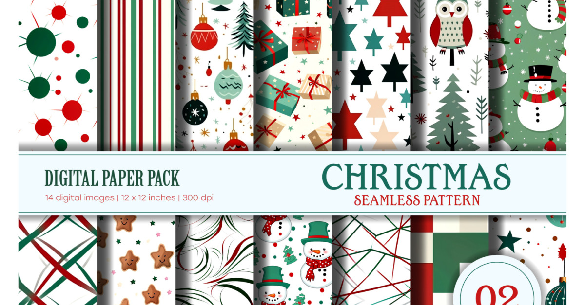 Collection Christmas of seamless pattern. 14 Beautiful winter seamless patterns, Christmas and New Year digital seamless patterns. Christmas trees, Christmas stocking, Christmas balls, reindeer and snowflakes texture. Collection of digital papers. Winter printing Sublimation.