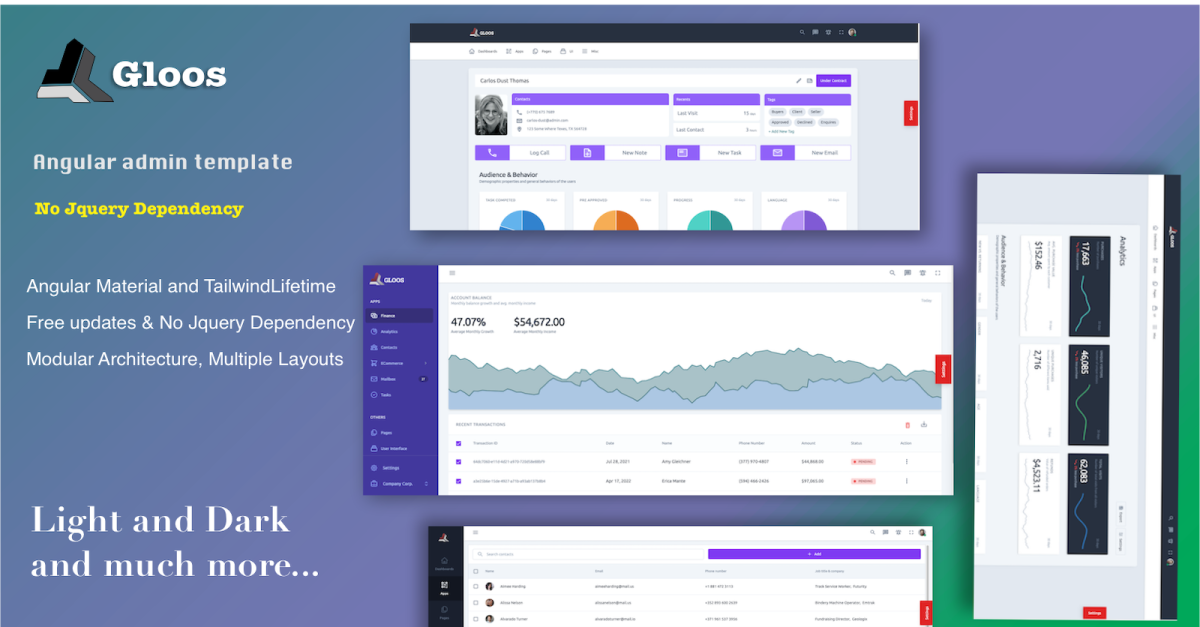 Gloos to oparty na modułach, wieloukładowy szablon administratora Angular, zawierający niestandardowe układy aplikacji i stron z pięknie wykonanym, czystym i minimalistycznym szablonem administratora z ciemnymi, jasnymi układami. Możesz zbudować dowolną aplikację internetową, taką jak interfejs oparty na Saas, eCommerce, CRM, CMS, aplikacje do zarządzania projektami, panele administracyjne itp. Konfiguracja wielu układów umożliwia korzystanie z wielu układów szablonów bez wprowadzania większych zmian w ogólnej strukturze szablon. Pozwala również na użycie innego układu dla każdej trasy.