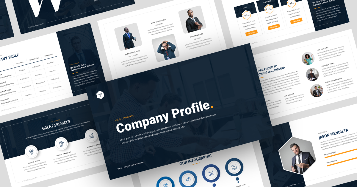 Przedstawiamy **Szablon prezentacji Prezentacji Google z profilem firmy**