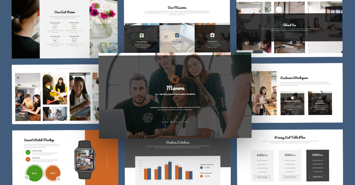 Mavera Coworking Space Business Google Slides Template Płaski, czysty, minimalistyczny, elegancki i elastyczny szablon prezentacji.