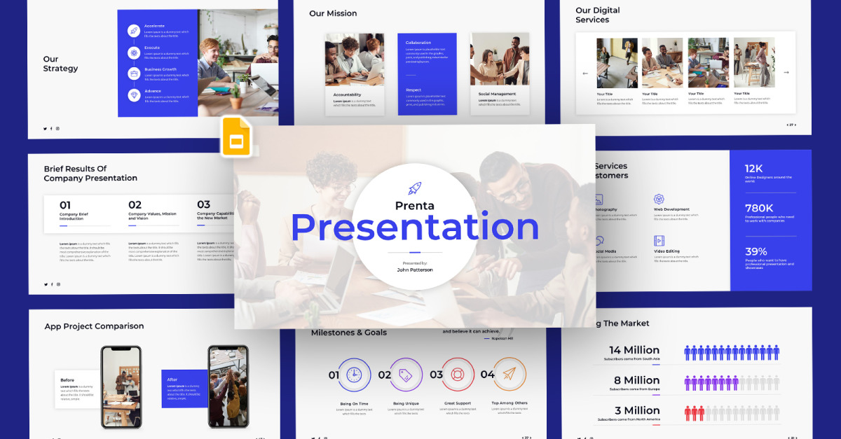 Szablon Prenta Company Business Google Slides Płaski, czysty, minimalistyczny, elegancki i elastyczny szablon prezentacji.