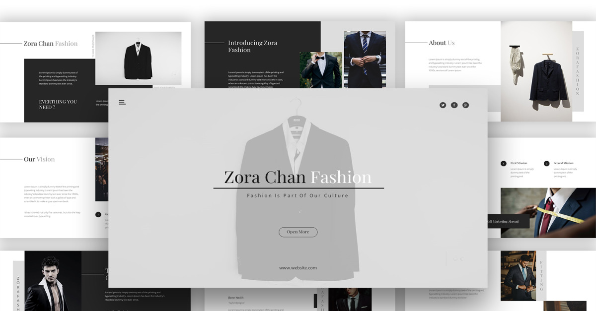 Zora Chan - Fashion Keynote Template to szablon prezentacji mody o płaskiej konstrukcji, czystej, minimalistycznej i nowoczesnej prezentacji, pasujący do branż kreatywnych, takich jak moda, agencje internetowe, branża fotograficzna, modelowanie i inne branże.