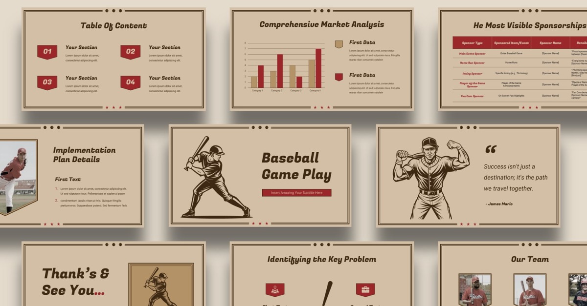 Uderz w swój home run z prezentacjami, korzystając z naszego szablonu Baseball Sport dla Google Slides. Ta prezentacja ma zachęcające, ciepłe beżowe tło zaakcentowane bogatymi, głębokimi czerwonymi i ciemnobrązowymi tonami, nadając autentyczny baseballowy klimat każdemu slajdowi. Zaprojektowany z angażującymi ilustracjami, ten szablon jest idealny do prezentowania strategii gry, statystyk drużynowych, profili graczy i wskazówek dotyczących treningu. Idealny dla trenerów, analityków sportowych i entuzjastów baseballu, ten szablon dodaje profesjonalnego, ale pełnego ducha akcentu do każdej prezentacji o tematyce baseballowej.