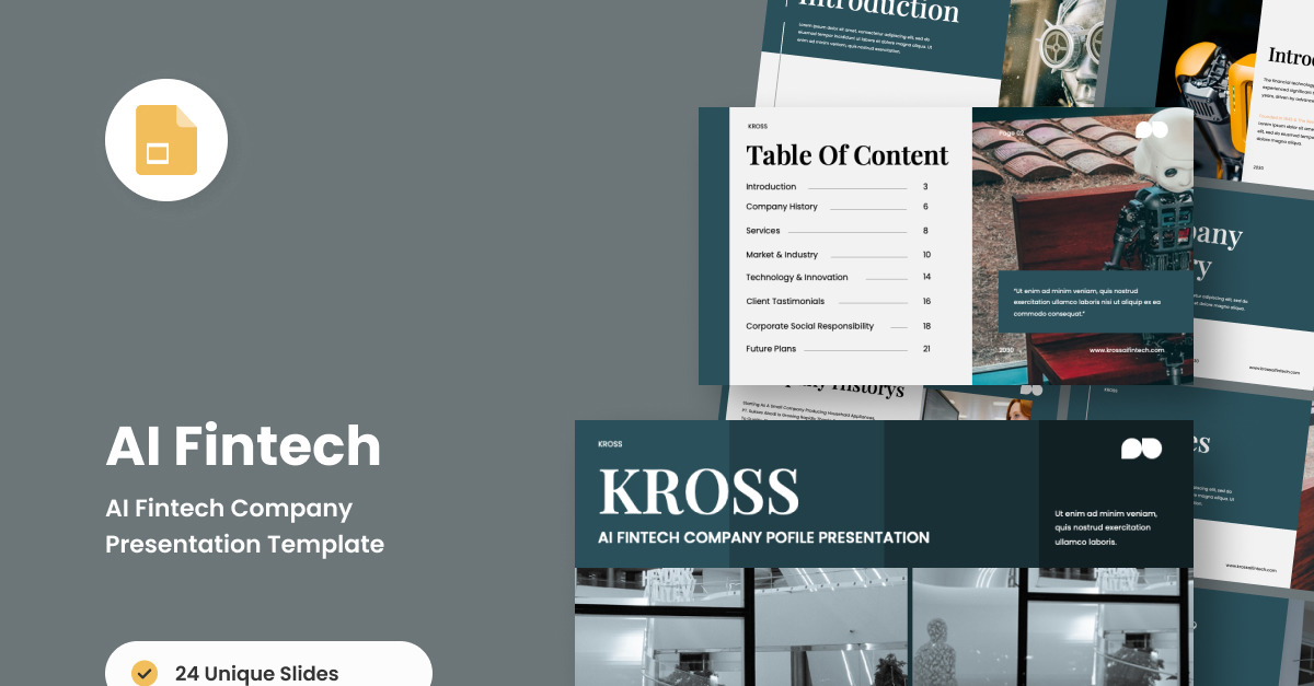 Zaprojektowany dla profesjonalistów fintech, AI Fintech oferuje wizualnie oszałamiającą prezentację z futurystycznym układem i intuicyjnymi elementami projektowymi. Idealny dla startupów technologicznych, instytucji finansowych i firm opartych na AI, które chcą zaprezentować innowacje w sposób przejrzysty i stylowy.