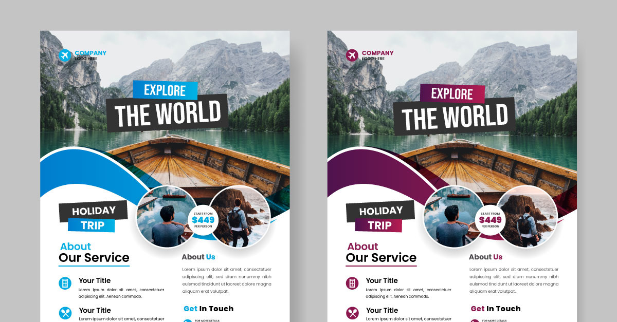 Szablon projektu ulotki podróżniczej dla biura podróży z pomysłami na kontakt i miejsce