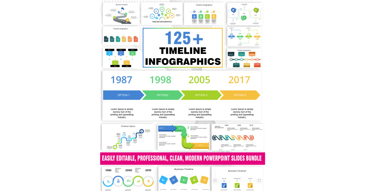 - Ponad 125 różnych slajdów osi czasu do wykorzystania w różnych celach i różnych branżach.