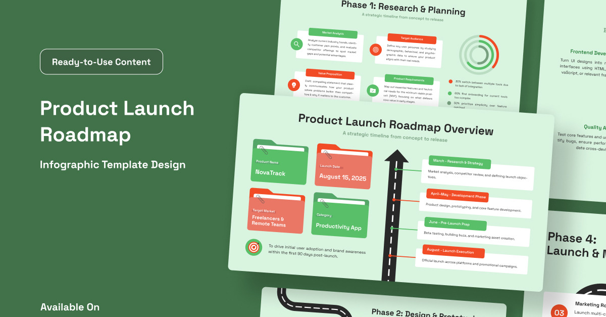 Podnieś poziom prezentacji produktów dzięki tej nowoczesnej i łatwej do zrozumienia infografice z mapą drogową. Idealna dla startupów i zespołów produktowych, które chcą jasno komunikować harmonogramy premier za pomocą odważnych wizualizacji i profesjonalnego stylu. Ten projekt obsługuje wiele stylów prezentacji z minimalistycznym podejściem i uderzającymi kolorami akcentującymi, aby przyciągnąć uwagę odbiorców.