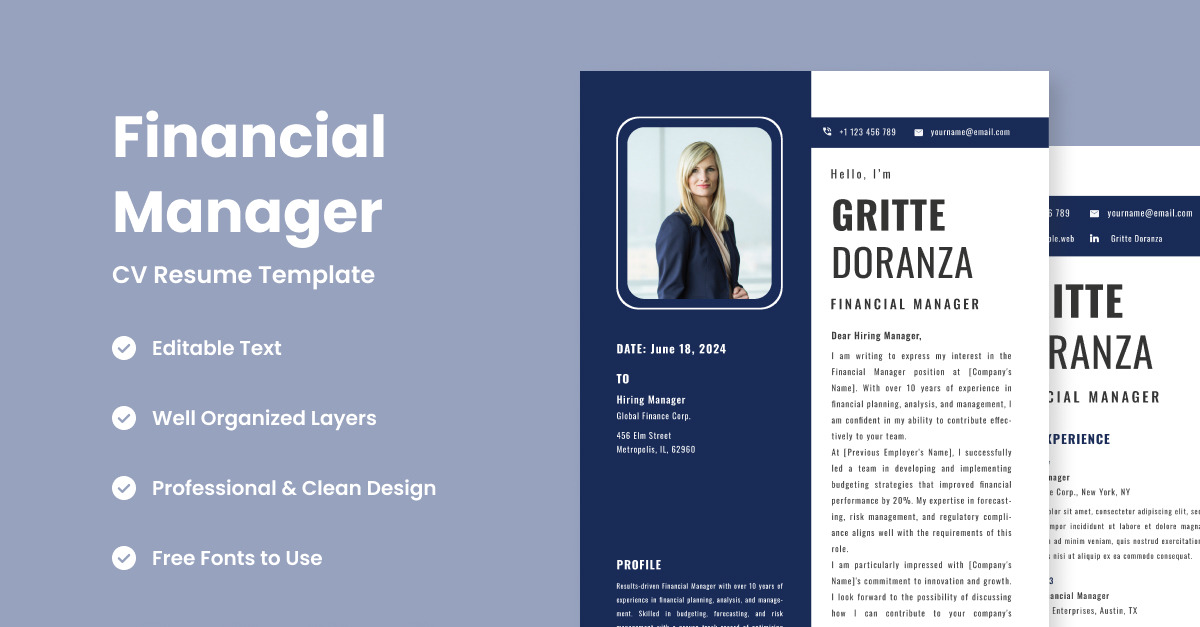 CV Resume Financial Manager V2 to kolejna ewolucja szablonów CV dla menedżerów finansowych 54 zł Pobrać