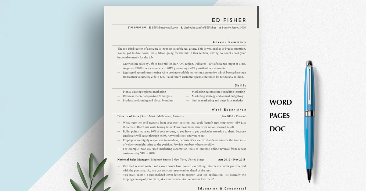 Szablon CV dyrektora generalnego | CV dla kadry kierowniczej w formatach Word, Google Docs i Pages | Minimalistyczny projekt CV
