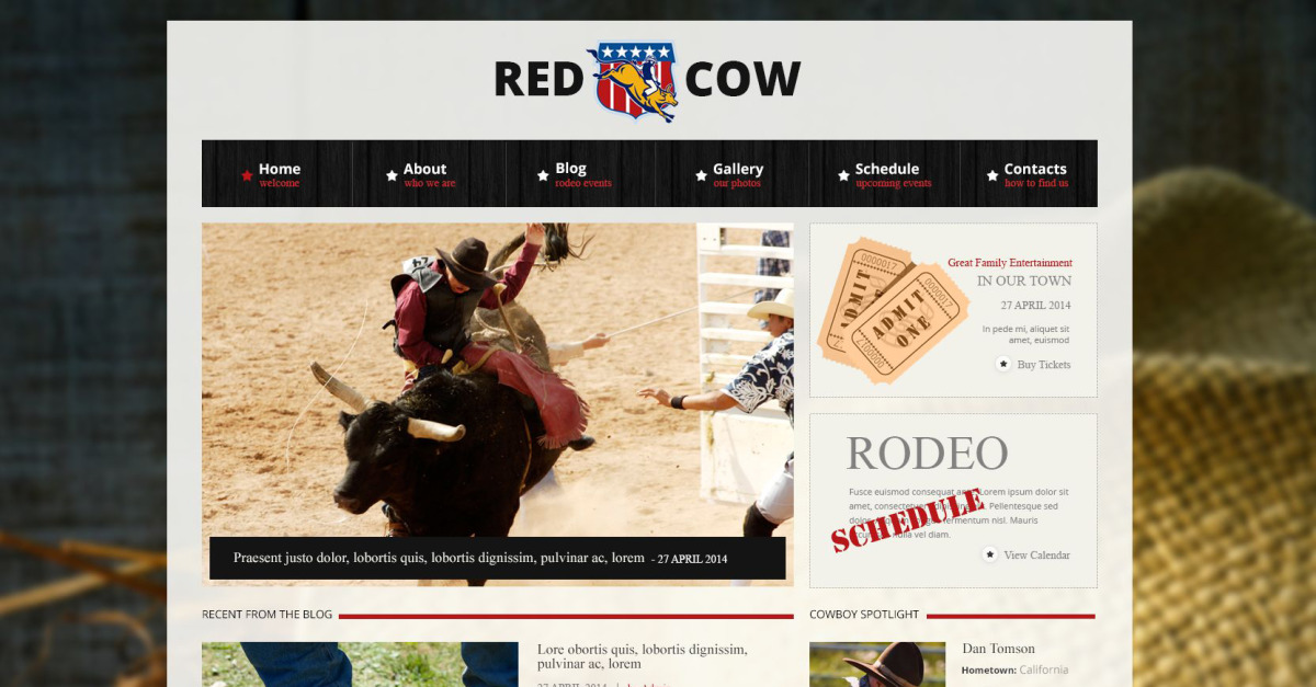 Będąc jedną z najniebezpieczniejszych czynności, jazda na byku gromadzi rzesze fanów, którzy chcą zobaczyć, jak nieustraszeni kowboje osiodłają wściekłe zwierzęta. Ponieważ biznes rodeo prężnie się obecnie rozwija, konkurencja zaangażowanych w niego firm rośnie w szybkim tempie. Jeśli chcesz pomóc jednemu z nich uczynić swoje usługi bardziej widocznymi w sieci, ten szablon na pewno się przyda. Będziesz miał okazję dodać pewności siebie kowbojom co do ich zręczności i dodać im energii do podejmowania wszelkich wyzwań dzięki swojej kolorystyce. Kierując się przypływem adrenaliny, odwiedzający Twoją witrynę będą mieli wrażenie, że dobrze się bawią, gdy zobaczą jasną grafikę. Ten szablon posłuży jako zachęta do przyciągnięcia większej liczby fanów rodeo do promowanej firmy.
