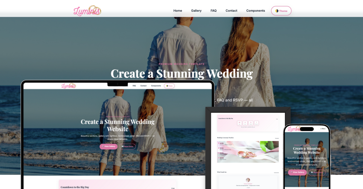 Luminis Wedding to wyrafinowany i nowoczesny szablon HTML przeznaczony na śluby, zaręczyny i romantyczne wydarzenia. Dzięki czystemu, pastelowemu designowi, eleganckiej typografii i płynnym animacjom, pozwala parom i organizatorom wydarzeń stworzyć profesjonalną stronę internetową w kilka minut.