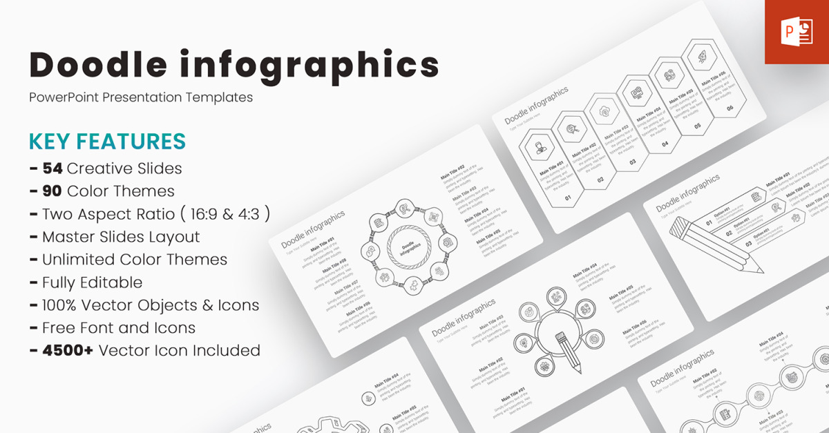 Szablony Doodle Infographics w programie PowerPoint to kreatywnie zaprojektowane slajdy prezentacji, które zawierają rysowane ręcznie ilustracje i grafiki w stylu szkicowym, służące przekazywaniu informacji w wizualnie angażujący i wyjątkowy sposób.