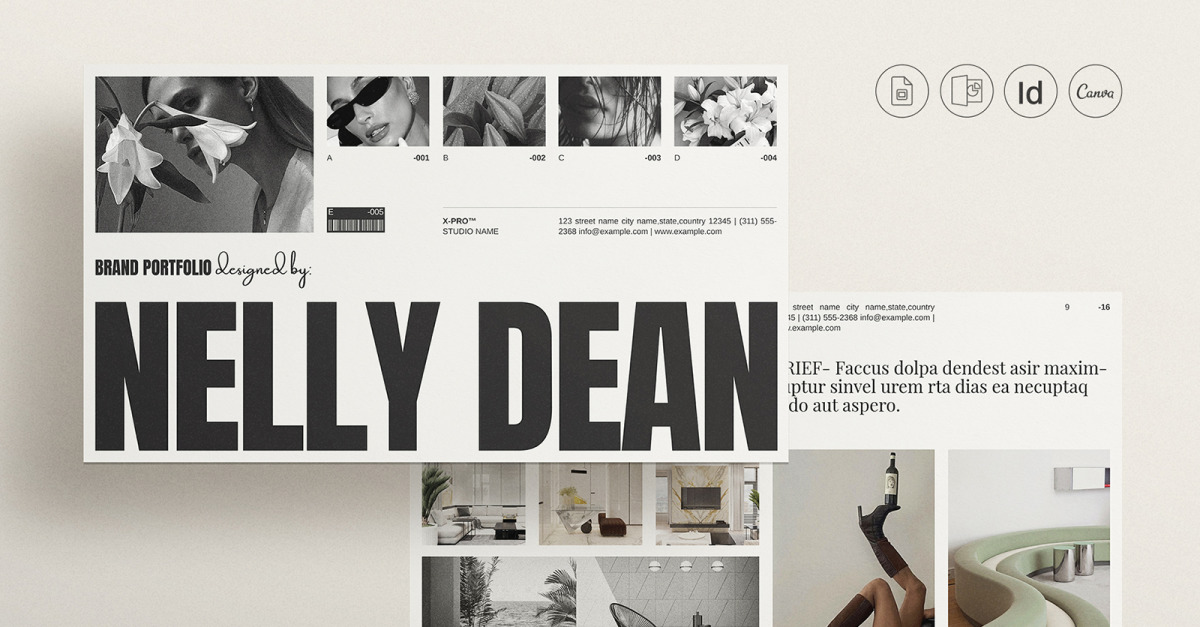 Prezentacja portfolio marki to zestaw 21 w pełni konfigurowalnych szablonów projektu układu przeznaczonych dla programów Adobe InDesign, PowerPoint i CANVA.