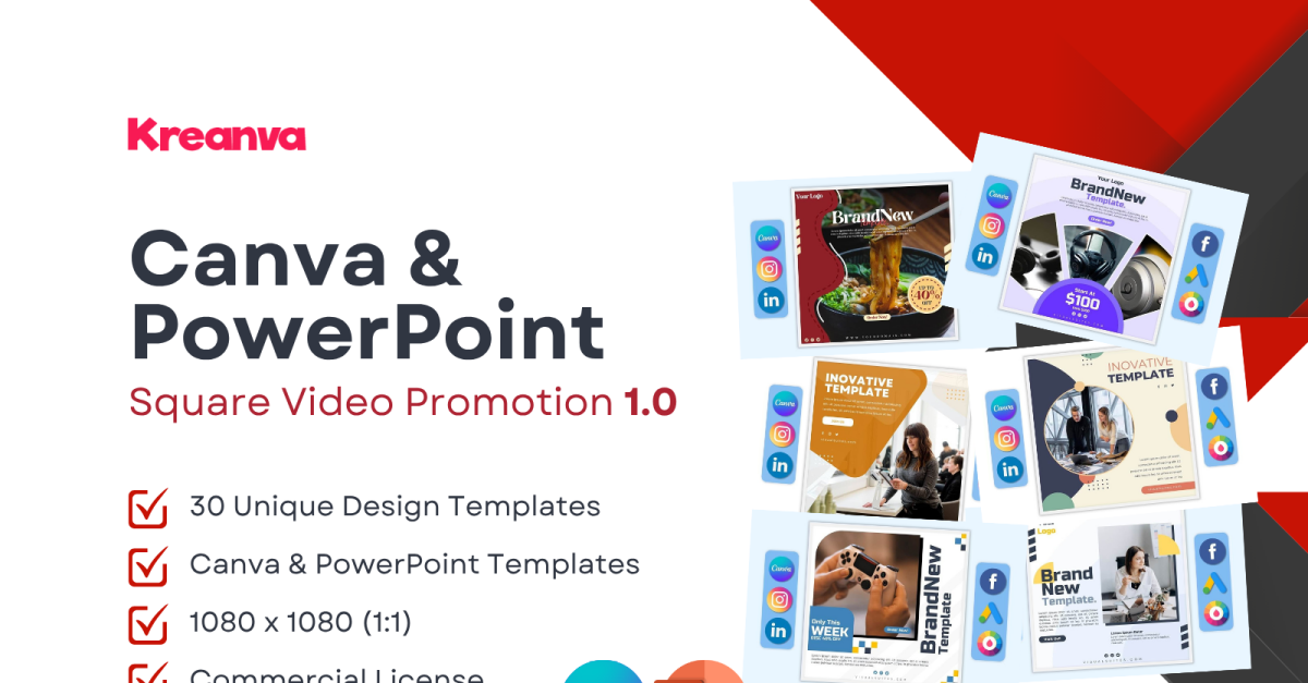 30 PROFESJONALNYCH kwadratowych szablonów promocyjnych wideo dla Canva i PowerPoint