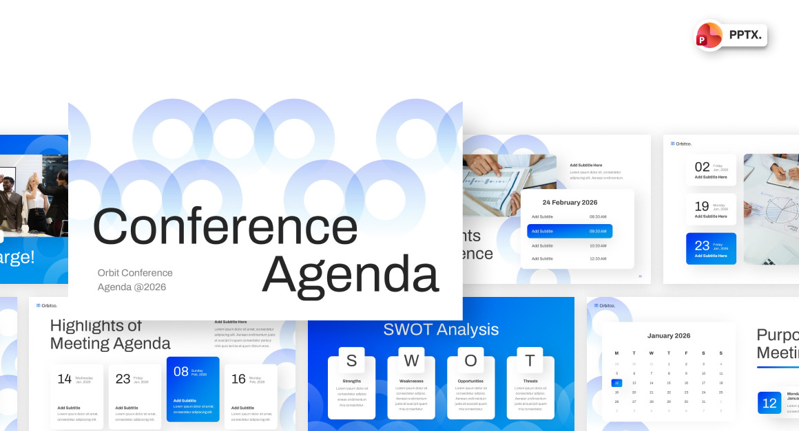 Szablon programu PowerPoint dla programu Conference Agenda to szablon prezentacji o nowoczesnym projekcie programu, odpowiedni na konferencje naukowe, imprezy korporacyjne i inne konferencje.