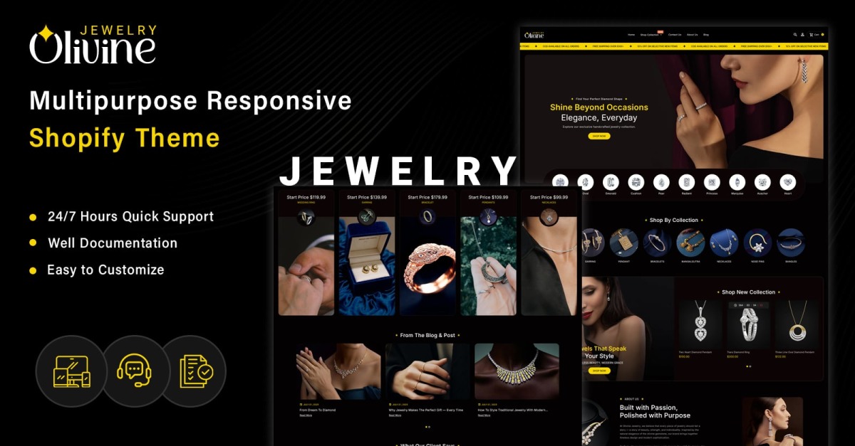 Olivine Jewelry – wielofunkcyjny responsywny szablon Shopify to luksusowe i nowoczesne rozwiązanie stworzone z myślą o internetowych sklepach jubilerskich, sklepach z akcesoriami modowymi i ekskluzywnych butikach. Zaprojektowany, aby wypromować Twoją markę, Olivine oferuje przejrzysty, elegancki układ, skupiając się na prezentacji produktów i doświadczeniu użytkownika. Zbudowany na wydajnym frameworku Bootstrap, ten szablon jest w 100% responsywny, dzięki czemu Twój sklep będzie wyglądał nieskazitelnie na wszystkich urządzeniach – od urządzeń mobilnych po komputery stacjonarne.