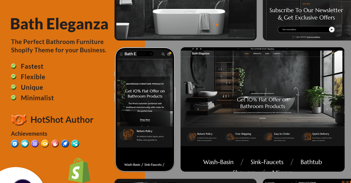 Bath Eleganza – motyw Shopify 2.0 dla mebli łazienkowych wyznacza nowy standard w luksusowym wystroju łazienek. Zaprojektowany z myślą o elegancji i praktyczności, ten motyw idealnie prezentuje wysokiej jakości meble i akcesoria łazienkowe – od eleganckich mebli łazienkowych po stylowe rozwiązania do przechowywania. Jest on stworzony zarówno dla wymagających właścicieli domów, jak i profesjonalistów zajmujących się aranżacją wnętrz.