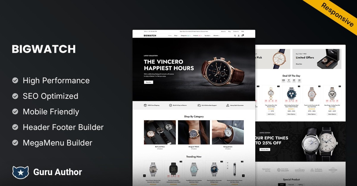 Przedstawiamy BigWatch, najlepszy motyw WooCommerce przeznaczony wyłącznie dla sklepów z zegarkami i biżuterią. Dzięki oszałamiającemu projektowi i płynnej integracji z Elementorem i WooCommerce, BigWatch zapewnia potężną platformę do prezentowania produktów i zwiększania sprzedaży online. Ten nowatorski motyw łączy w sobie elegancką estetykę, przyjazną dla użytkownika nawigację i zaawansowaną funkcjonalność, aby zapewnić Twoim klientom niezrównane doświadczenia zakupowe.