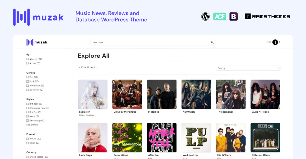 Stwórz najpełniejszą muzyczną bazę danych na WordPressie, z importem metadanych Discogs na żywo i automatycznymi tekstami piosenek od Genius. MUZAK to jedyny motyw, który pozwala zbudować prawdziwą encyklopedię muzyczną — wykonawców, albumy, dyskografie, utwory, teksty, odtwarzacze audio, recenzje, oceny, aktualności… wszystko w jednym, potężnym rozwiązaniu.