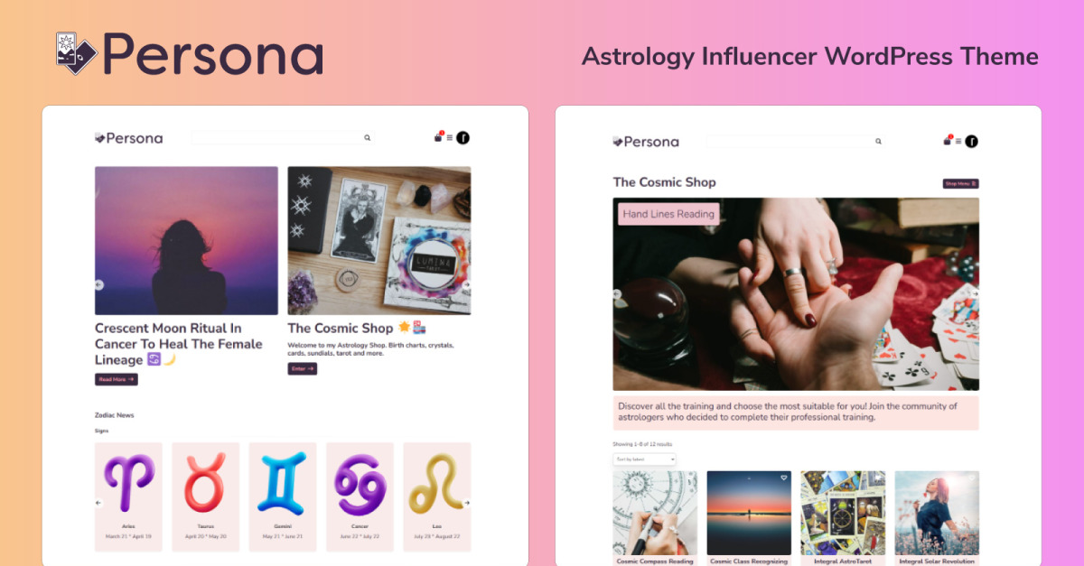 PERSONA to pięknie zaprojektowany motyw WordPress i WooCommerce stworzony dla profesjonalistów z dziedziny astrologii, trenerów duchowych i przedsiębiorców holistycznych. Niezależnie od tego, czy sprzedajesz karty tarota, runy, kryształy czy produkty metafizyczne , czy oferujesz usługi transformacyjne, takie jak konstelacje rodzinne, astrologia psychologiczna, warsztaty i kursy – PERSONA zapewnia elastyczną platformę, która pozwoli Ci pewnie i przejrzyście uruchomić Twoją obecność online.