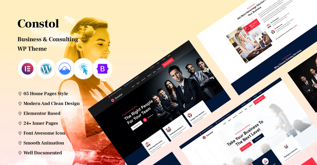 Constol Business Consulting WordPress Theme for Wielofunkcyjny, nowoczesny, profesjonalny, czysty, kreatywny i łatwy w użyciu WordPress Theme. Constol jest odpowiedni dla korporacyjnych stron internetowych, takich jak firmy konsultingowe, agencje, startupy, agencje biznesowe. Motyw WordPress jest responsywny, możesz go przeglądać również na urządzeniach mobilnych/tabletach i wygląda bardzo dobrze na większej liczbie urządzeń. Zbudowaliśmy ten motyw za pomocą PageBuilder. Constol zapewnia najpłynniejsze wrażenia podczas tworzenia witryny za pomocą naszego motywu.