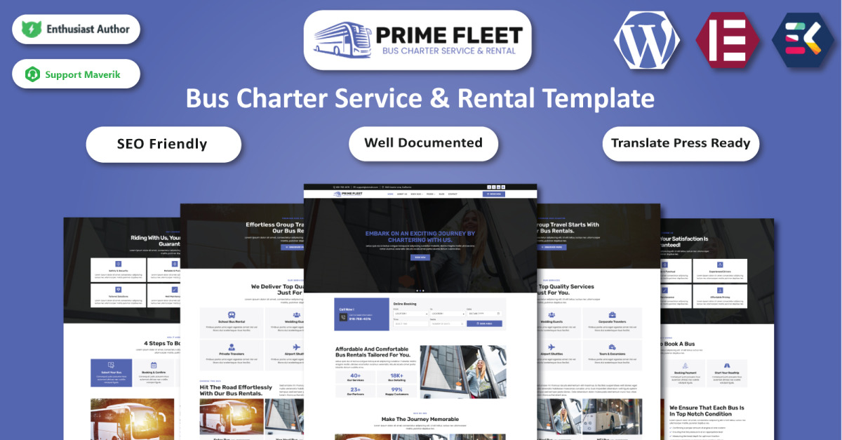 Prime Fleet to elegancki i nowoczesny szablon WordPress zaprojektowany specjalnie dla firm wynajmujących i czarterujących autobusy. Zbudowany z Elementor , ma intuicyjny interfejs, konfigurowalne układy i responsywność na urządzeniach mobilnych. Ułatwia to Twojej flocie, usługom i rezerwacjom online.