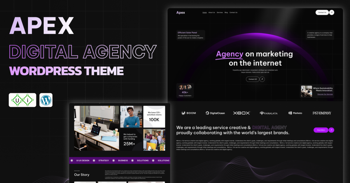 Apex to kreatywny motyw WordPress zaprojektowany specjalnie dla agencji cyfrowych, kreatywnych portfolio i firm, które chcą zrobić trwałe wrażenie online. Dzięki eleganckiemu i nowoczesnemu projektowi ten kreatywny motyw WordPress portfolio pomaga zaprezentować Twoją pracę, usługi i zespół w wizualnie uderzający sposób. Niezależnie od tego, czy jesteś freelancerem, czy uznaną agencją, Apex zapewnia, że Twoja witryna wygląda profesjonalnie, funkcjonalnie i jest łatwa w nawigacji.