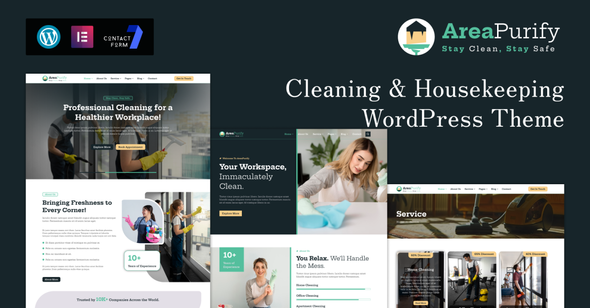 AreaPurify to starannie zaprojektowany, nowoczesny motyw WordPress stworzony specjalnie dla firm sprzątających, firm remontowo-budowlanych, ekip sprzątających i wszelkich firm usługowych, które koncentrują się na czystości i higienie. Niezależnie od tego, czy prowadzisz firmę sprzątającą domy, agencję sprzątającą biura, czy wyspecjalizowaną firmę sprzątającą mieszkania, AreaPurify zapewni Ci cyfrową obecność niezbędną do budowania zaufania i poszerzania bazy klientów.