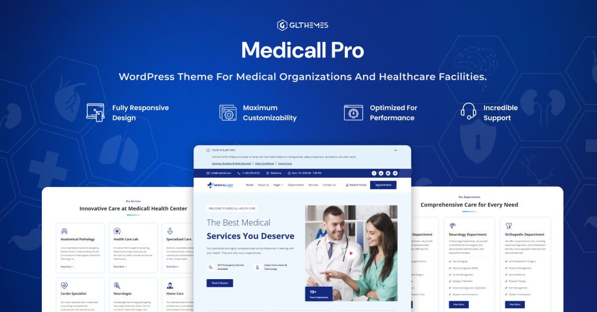 Medicall Pro to elegancki i lekki motyw WordPress zaprojektowany specjalnie dla szpitali, klinik i firm świadczących usługi medyczne. Motyw został profesjonalnie zaprojektowany, aby skutecznie zaprezentować Twoją firmę i usługi w świecie online. Motyw jest w pełni responsywny i działa płynnie na wszystkich urządzeniach, od telefonów po komputery stacjonarne. Ponadto, jego przyjazny dla użytkownika design ułatwia odwiedzającym nawigację po Twojej witrynie. Medical Care nie tylko świetnie wygląda i jest łatwy w obsłudze, ale także pomaga Twojej witrynie uzyskać wyższą pozycję w wynikach wyszukiwania dzięki przyjaznemu dla SEO projektowi.