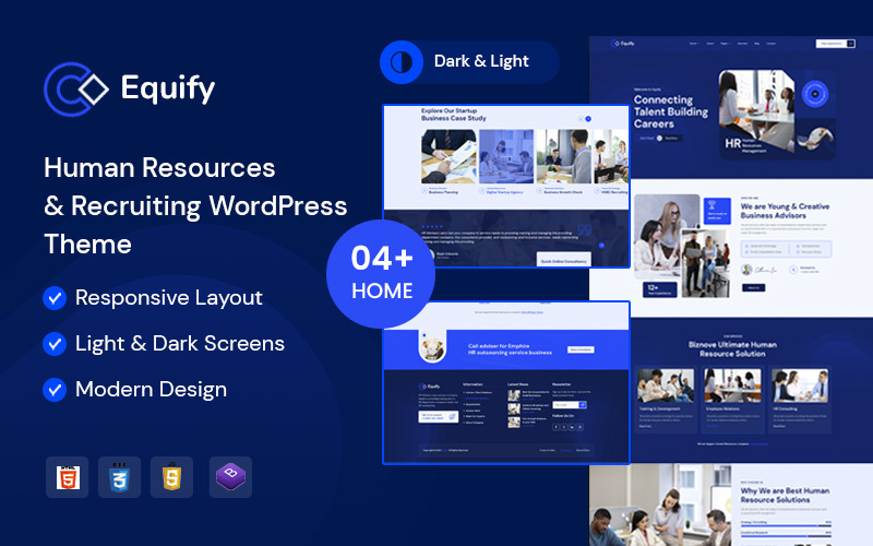 Dzięki przejrzystemu, korporacyjnemu i profesjonalnemu designowi , Equify umożliwia firmom prezentację swoich rozwiązań HR, usług rekrutacyjnych, programów pośrednictwa pracy, szkoleń pracowników, zarządzania płacami i doświadczenia w doradztwie korporacyjnym . Motyw zawiera gotowe strony z usługami, studiami przypadku, referencjami, ofertami pracy, profilami zespołów i blogami , zapewniając kompleksową i angażującą obecność online.