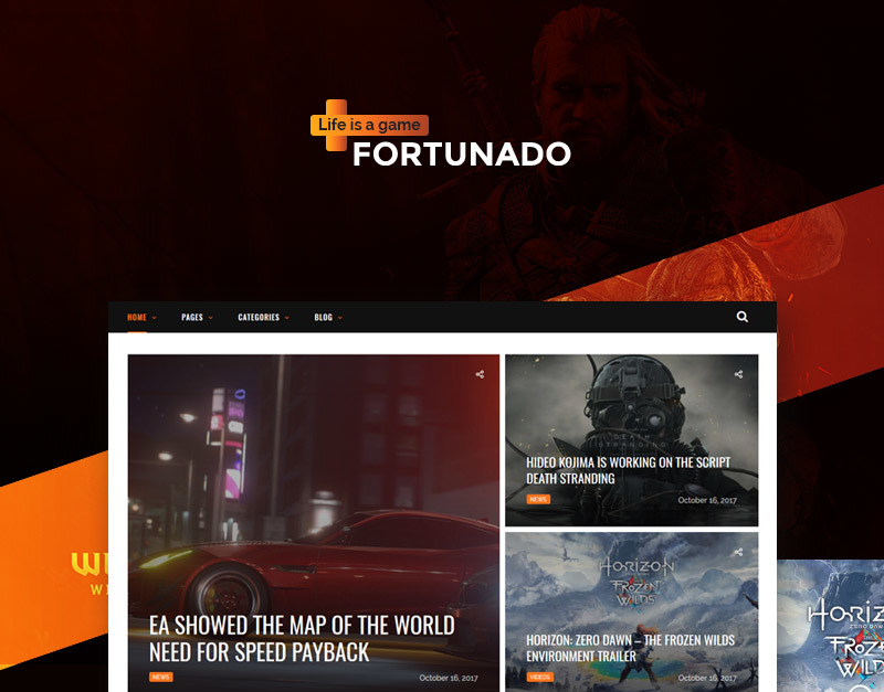 Fortunado - To wyjątkowy i wygodny motyw WordPress dla fanów gier komputerowych, blogów o grach lub dużych portali z grami. Będziesz mógł informować wszystkich na bieżąco o wydarzeniach w branży gier, najnowszych wiadomościach oraz nowych zwiastunach i wydaniach. Jasny styl, w jakim wykonany jest motyw WordPress, przyciąga młodych ludzi i miłośników gier.