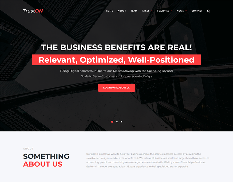 Szukasz najlepszego motywu WordPress do uruchomienia wspaniałej witryny usług biznesowych? Ten innowacyjny Truston jest dla Ciebie odpowiedni! Jest to elegancki motyw o w pełni responsywnym wyglądzie, prawdziwie intuicyjnym charakterze i ogromnym zestawie potężnych funkcji. Tutaj otrzymujesz bogaty wybór dodatkowych stron, które pomogą Ci szczegółowo opowiedzieć o Twojej firmie. Co więcej, ten motyw zawiera szeroką gamę elementów statycznych i dynamicznych, dlatego możesz wyróżnić wszystkie informacje różnymi typami treści. Truston jest wyposażony w prosty kreator stron Elementor typu „przeciągnij i upuść”, który pozwala łatwo stworzyć stronę internetową. Możesz stworzyć w pełni funkcjonalną stronę internetową bez żadnych umiejętności programistycznych. Zaprezentuj swoje usługi, swój zespół i stwórz niezawodny wygląd swojej witryny, prezentując referencje klientów. Co więcej o Trustonie? Uderz w demo, aby odkryć!