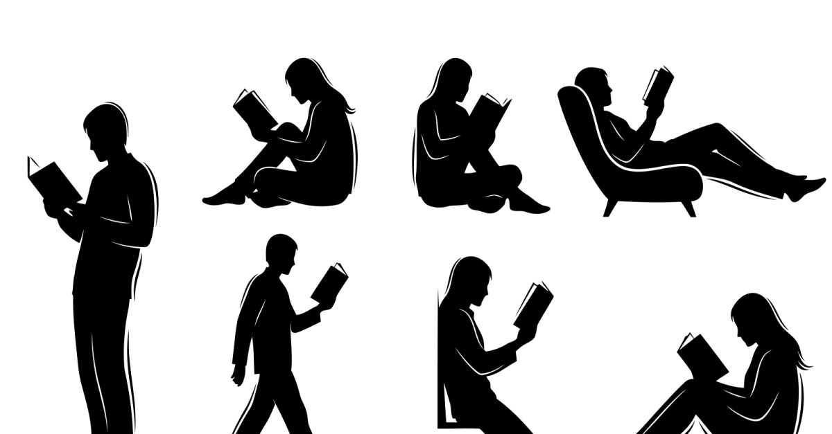 Różnorodni ludzie lubią czytać książki w przytulnym domowym otoczeniu, sylwetka na białym tle 33 zł Pobrać