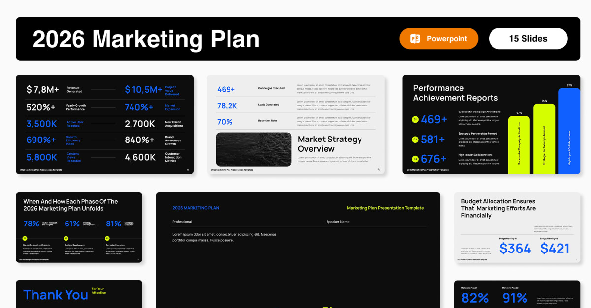 Present your marketing vision for the year ahead with the 2026 Marketing Plan PowerPoint Template. This modern, professional presentation deck is designed to help you communicate strategies, objectives, and insights effectively — perfect for agencies, startups, and business teams preparing for the new marketing cycle.