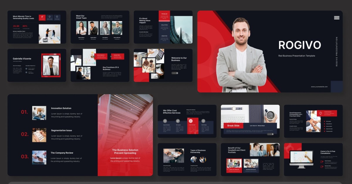 Make your ideas stand out with the Rogive – Red Business PowerPoint Presentation Template. Featuring a bold red color theme and sleek professional layouts, this template is crafted to capture attention and communicate confidence. Rogive balances creative flair with corporate polish, making it perfect for business pitches, performance reviews, and company presentations.