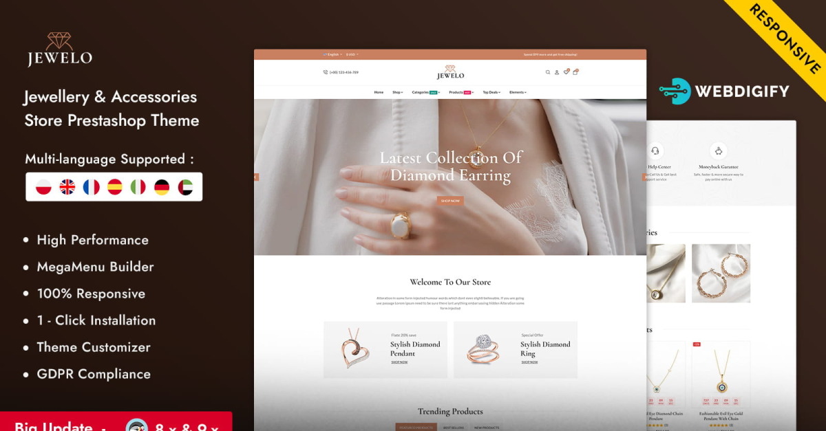At Webdigify, we proudly introduce Jewelo – Jewellery and Accessories Multipurpose Responsive PrestaShop Elementor Store, a beautifully crafted eCommerce theme designed to showcase elegance, luxury, and style. Perfect for brands that want to create a premium online presence, Jewelo is ideal for businesses in Accessories, Jewelry Templates, Wedding Templates, and Women’s Fashion niches.