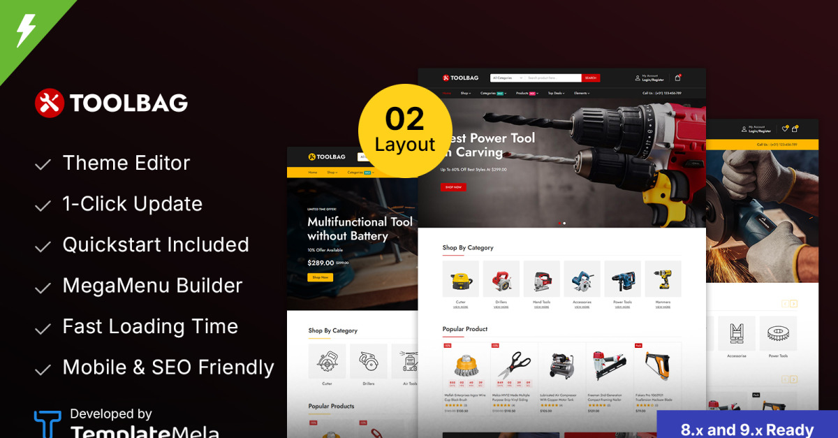 Toolbag is a robust and modern PrestaShop 9 responsive theme designed specifically for hardware, tools, and equipment stores. Whether you sell power tools, hand tools, building materials, or industrial supplies, Toolbag offers a professional and efficient layout that highlights your products with clarity and style.