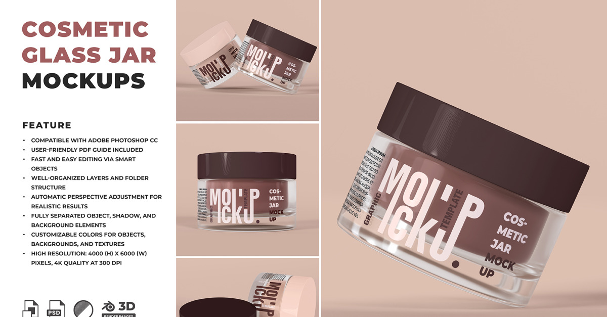 Showcase your product branding with these high-quality Cosmetic Glass Jar Mockups. Designed for ultimate customization, these PSD files use Smart Objects for easy editing—just drag and drop your artwork. All objects, shadows, and backgrounds are fully separated, letting you change colors, textures, and layouts with complete control. Perfect for presenting skincare, beauty, or wellness packaging in a realistic and professional way.
