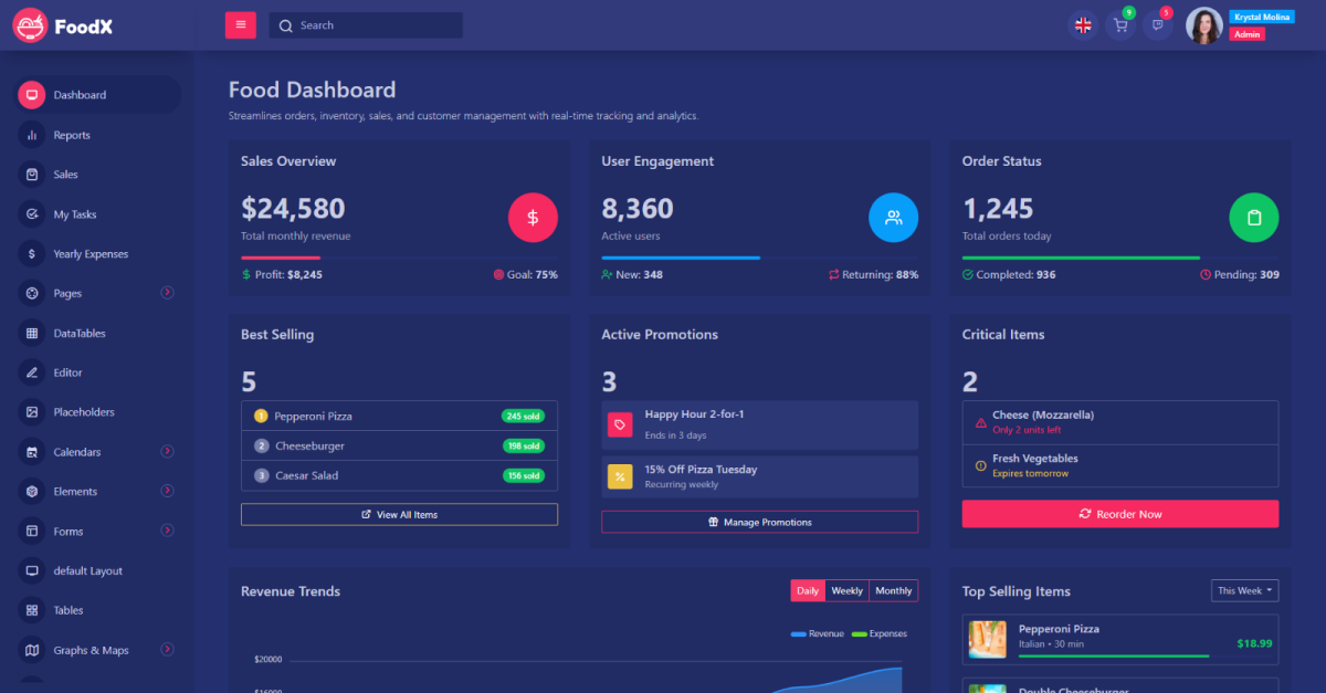 O FoodX é um painel de administração de alimentos poderoso e rico em recursos, projetado para restaurantes, serviços de entrega de alimentos, cozinhas em nuvem e empresas de buffet. Desenvolvido com Bootstrap , este painel moderno e intuitivo ajuda a otimizar operações, gerenciar pedidos , acompanhar vendas , monitorar estoque e aprimorar a experiência do cliente. Com uma interface amigável e design responsivo, o FoodX garante um desempenho perfeito em todos os dispositivos, tornando-se a escolha ideal para proprietários, gerentes e empresas de entrega de alimentos.