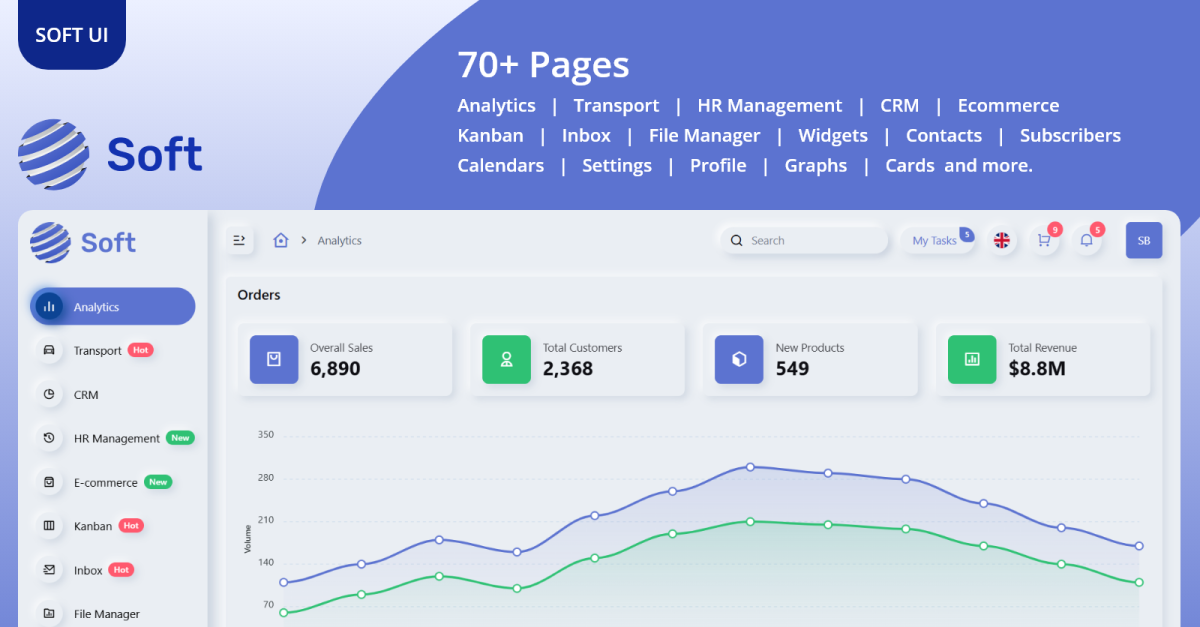 Soft UI é um modelo de painel de administração Bootstrap 5 moderno e integrado, com uma interface suave e sofisticada, paletas de cores harmoniosas e tipografia refinada. Oferece aos desenvolvedores uma plataforma visualmente atraente e fácil de usar, adaptada para sistemas de CRM, painéis de análise, backends de e-commerce e ferramentas internas. O modelo inclui layouts cuidadosamente elaborados, como Analytics, CRM, Gestão de RH, E-commerce, Kanban, Caixa de Entrada e Gerenciador de Arquivos, além de componentes versáteis como acordeões, modais, dicas de ferramentas, cartões avançados, elementos de formulário, assistentes, gráficos, mapas, ícones, tabelas e diversos utilitários de interface do usuário.