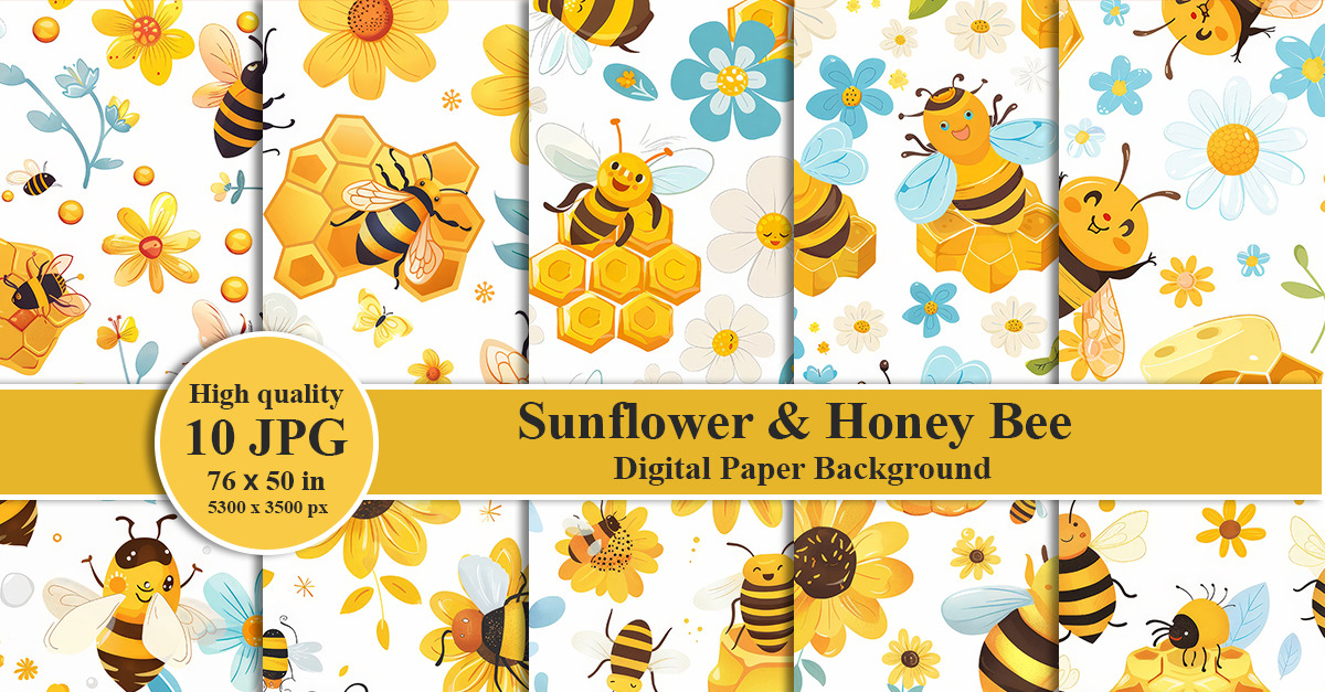 Girassol e abelha para impressão em papel digital e fundo com padrão