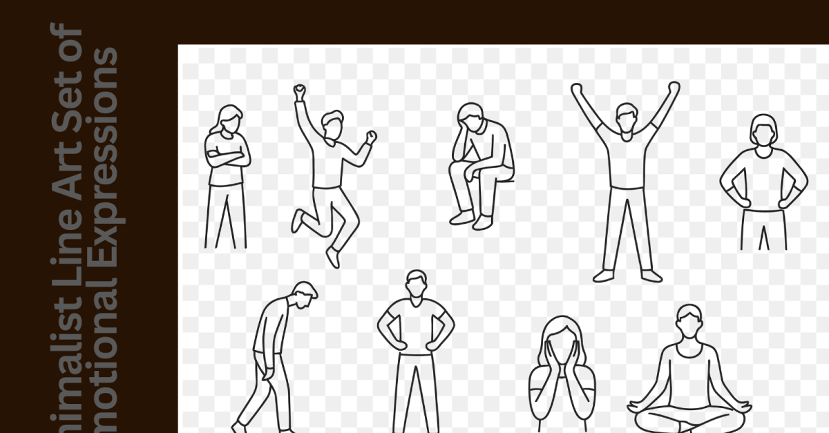 Conjunto de arte minimalista de linhas com expressões emocionais – alegria, tristeza, confiança, ansiedade e calma