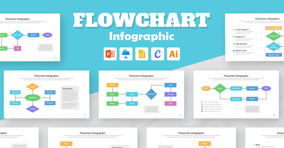 Os modelos de infográfico de fluxograma são a melhor maneira de exibir seus dados em formato gráfico. Esses fluxogramas são projetados profissionalmente e especificamente para as necessidades de redatores, editores e profissionais de marketing de conteúdo de infográficos que desejam criar infográficos atraentes rapidamente.
