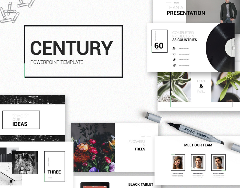 Apresentando o modelo Century Powerpoint com mais de 100 slides exclusivos, apresente seu projeto com um conceito gráfico diferente, mais de 150 esquemas de cores para escolher e alterar em apenas um clique.