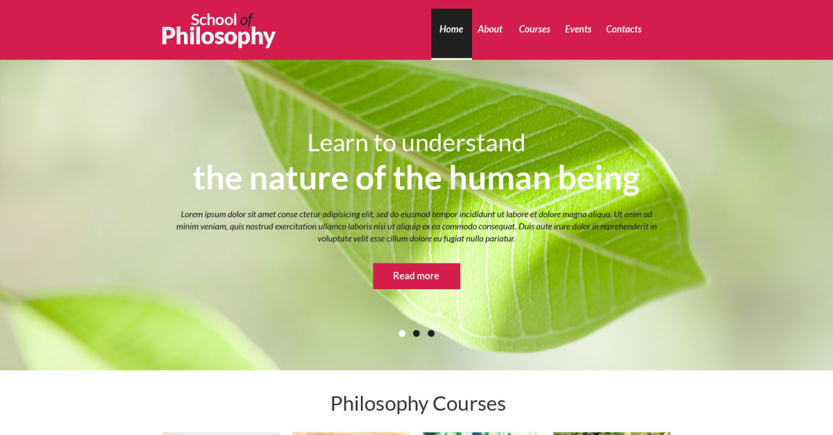 Muitos de nós buscamos alcançar a iluminação espiritual e descobrir o mundo em todas as suas manifestações. Para melhor interpretar as coisas que nos acontecem e encontrar o sentido da vida, recorremos à filosofia. Este tema bem codificado seria a solução perfeita para o seu clube de interesse. Com sua ajuda, você poderá relaxar e excitar o público ao mesmo tempo. Graças aos seus suaves tons de verde claro, os usuários sentirão o alívio de navegar em seu site, enquanto os campos de corais brilhantes o ajudarão a focar sua atenção nas coisas que importam. Blocos de destaque baseados em grade, magistralmente organizados, ajudarão você a apresentar melhor as pessoas ao seu negócio e despertar a curiosidade para investigar mais. Ao decorar seu site com esse tema, você fará com que os alunos acreditem que encontraram o lugar certo para desfrutar de uma experiência de aprendizado emocionante.