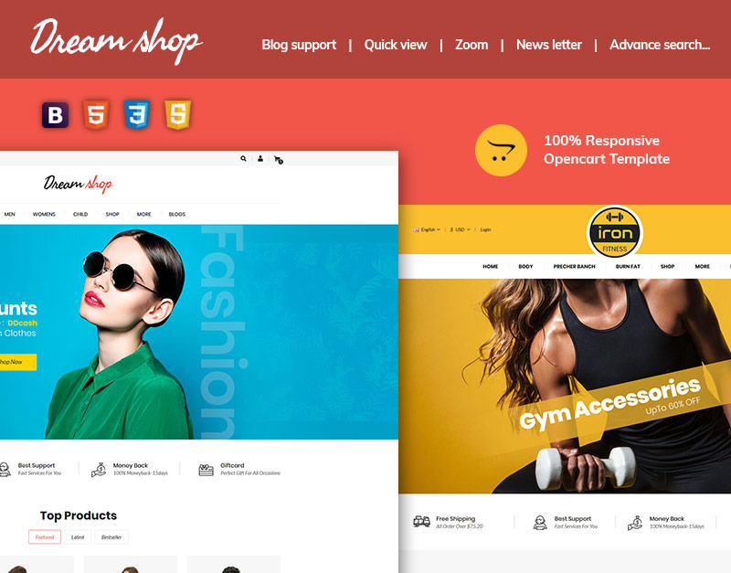 Dreamshop Multipurpose Responsive OpenCart Template é perfeitamente projetado para moda, academia e loja multiuso. O modelo parece ótimo e profissional.
