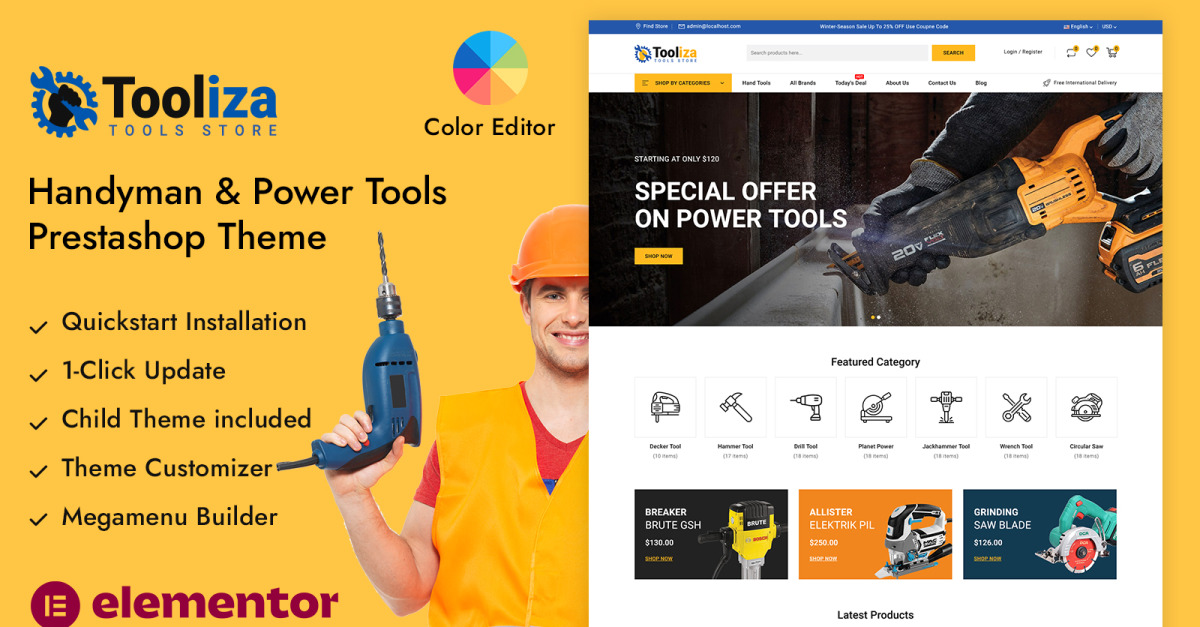 O tema responsivo Tooliza para PrestaShop, ideal para lojas de ferramentas elétricas e de materiais de construção, foi desenvolvido para lojas de ferragens, revendedores de ferramentas elétricas, lojas de materiais de construção, lojas de equipamentos para construção e fornecedores de ferramentas industriais. Com seu layout arrojado, limpo e estruturado, o Tooliza cria uma presença online impactante que exibe ferramentas, máquinas e equipamentos com máxima clareza e impacto.