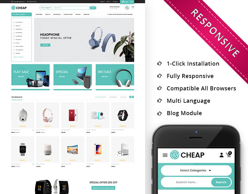 A loja eletrônica barata é um modelo Prestashop responsivo para toda a loja de comércio eletrônico. Este modelo baseado em Bootstrap foi cuidadosamente categorizado com base na indústria para todas as suas fantásticas lojas online. Este modelo vem com Mega Menu, Owl Carousel Slider, Google Font, Font Awesome Icon, Material Icon, Magnific Popup, W3C Validate Markup, Working Contact Form, jQuery mais recente e muito mais. Você pode usar este modelo para eletrônicos, computadores, móveis, moda, acessórios, alimentos, roupas, roupas, cozinha, joias, ferramentas, remédios, mega, lojas mínimas e multiuso .